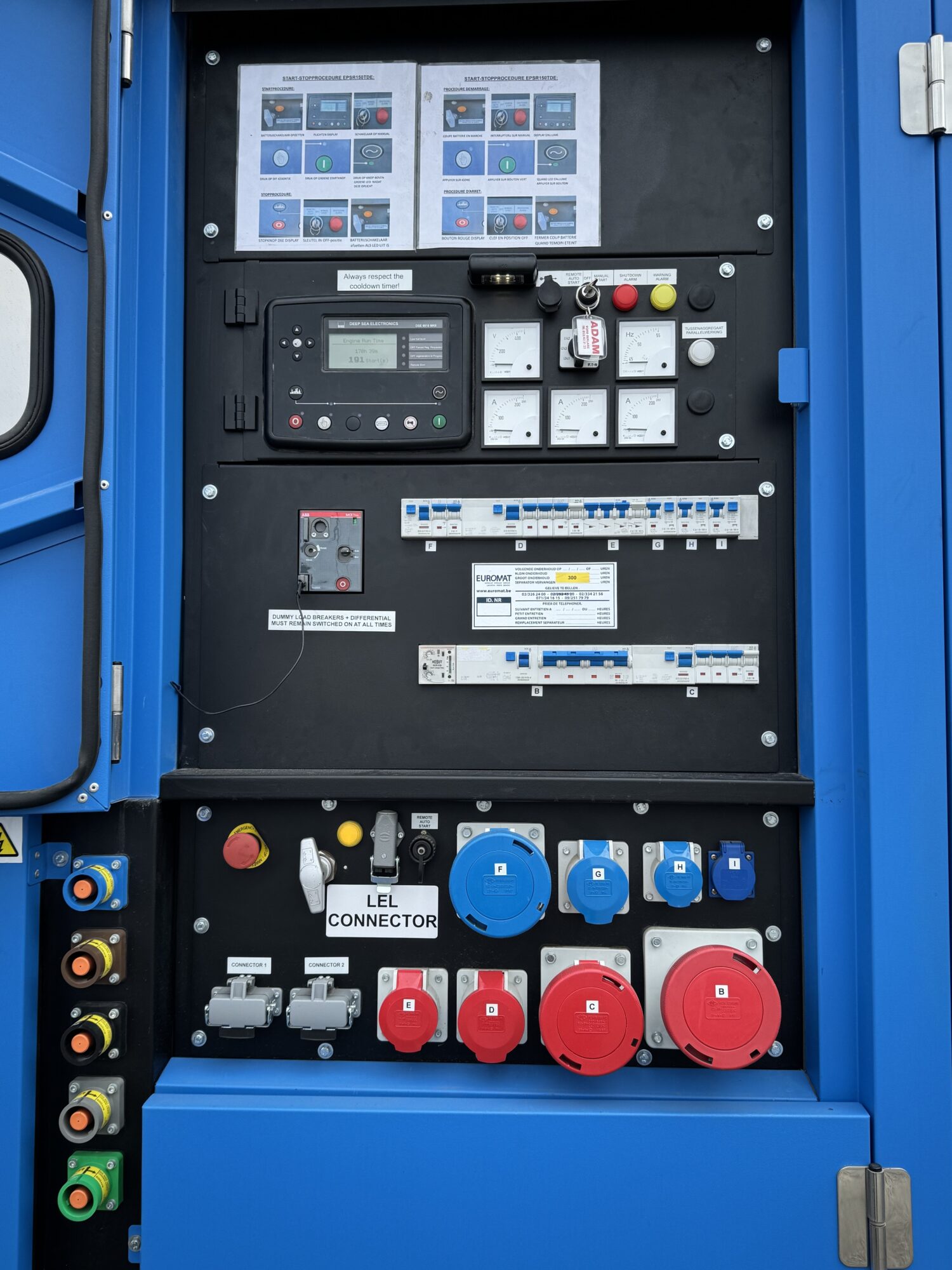 1 x 230V mono – 16A (Shuko), 1 x CEE 230 V mono – 16A, 1 x CEE 5P 32A 400V, 1 x CEE 5P 63A 400V, 1 x CEE 5P 125A 400V, 1x SET (5) QUICK CONNECTOREN POWERSAFE