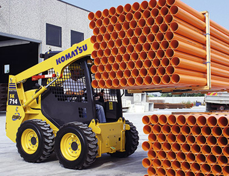 La chargeuse compacte sur pneus Komatsu SK714-5 est une machine robuste conçue pour des performances maximales sur les chantiers compacts. La machine est dirigée et propulsée en la faisant « »glisser » » sur le sol. Cette direction unique rend la chargeuse compacte facile à manœuvrer dans les espaces restreints où un court rayon de braquage est nécessaire – idéal pour les chantiers urbains ou les zones de travail étroites.