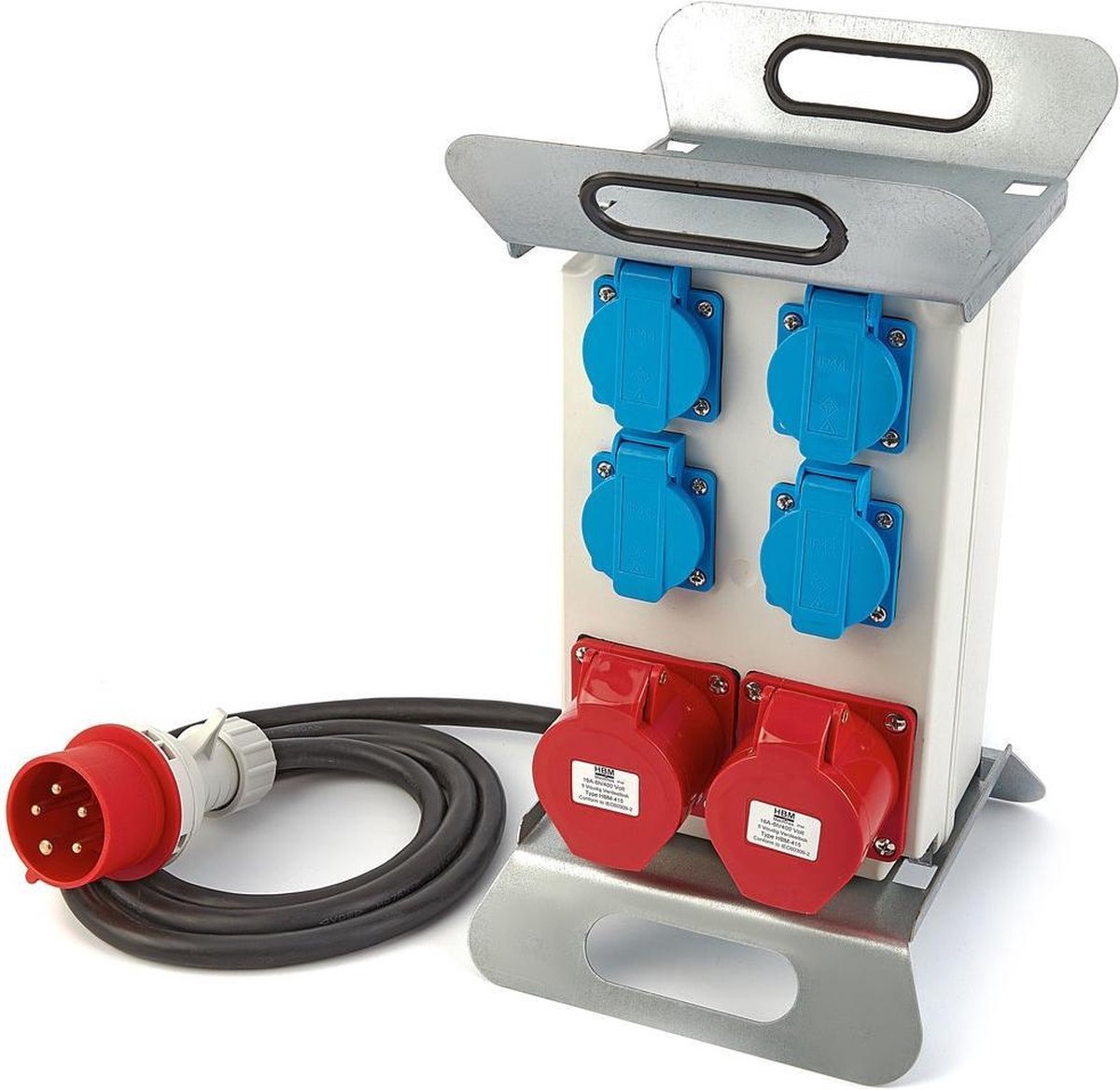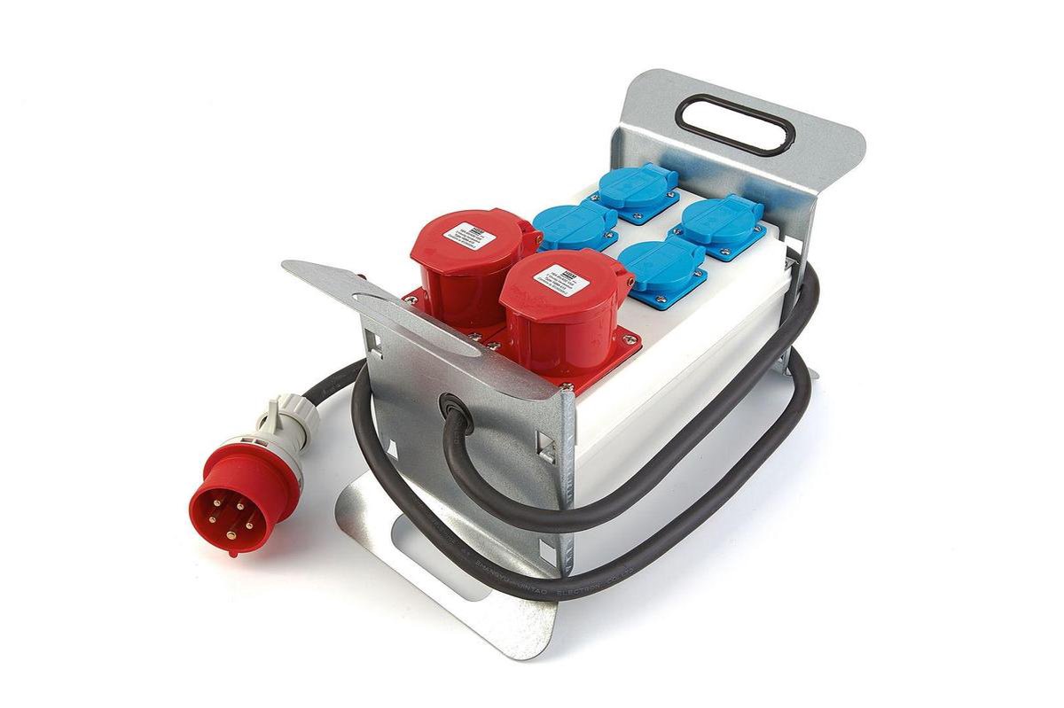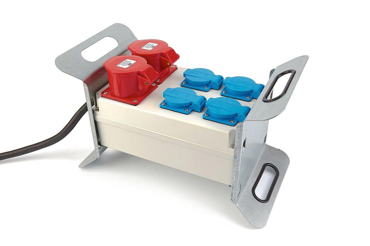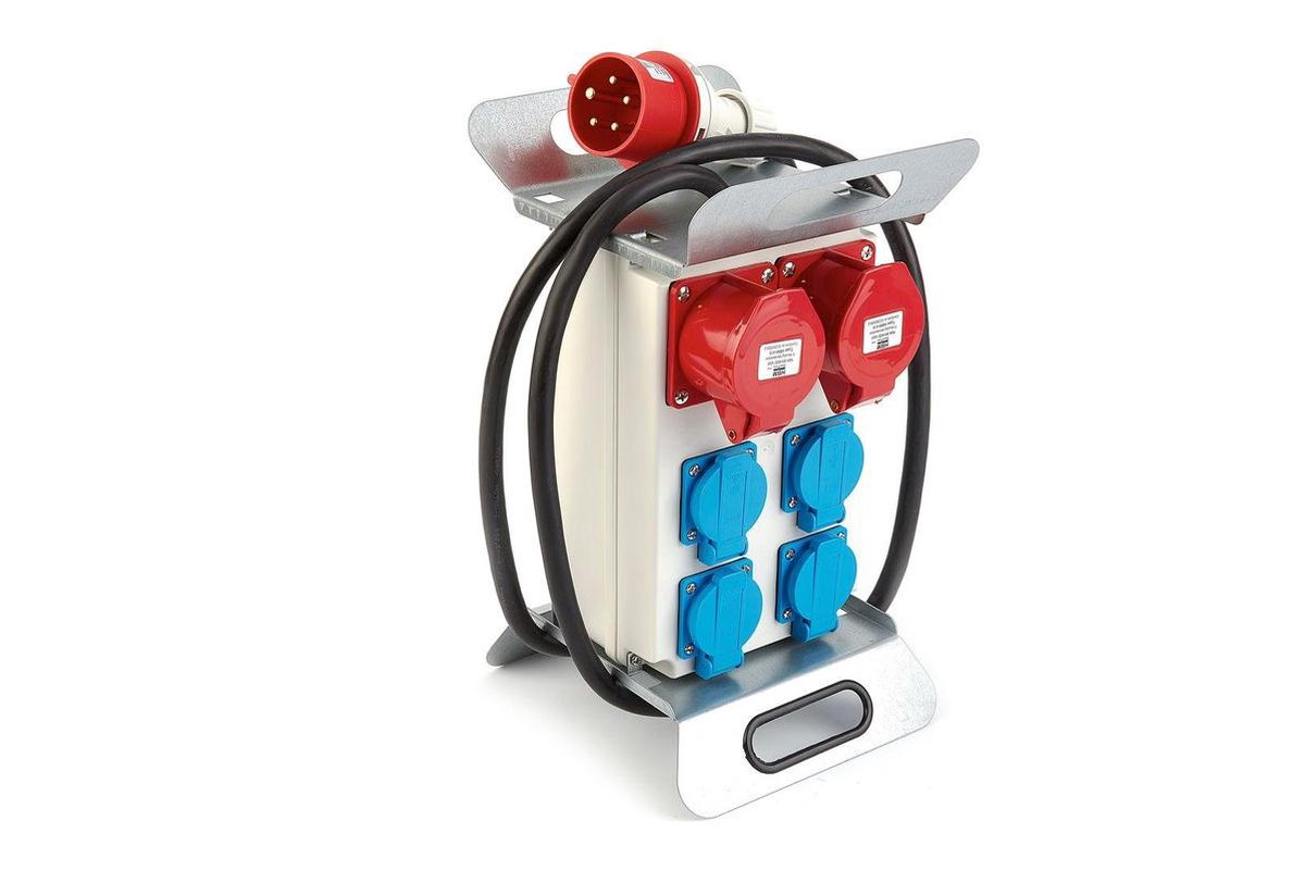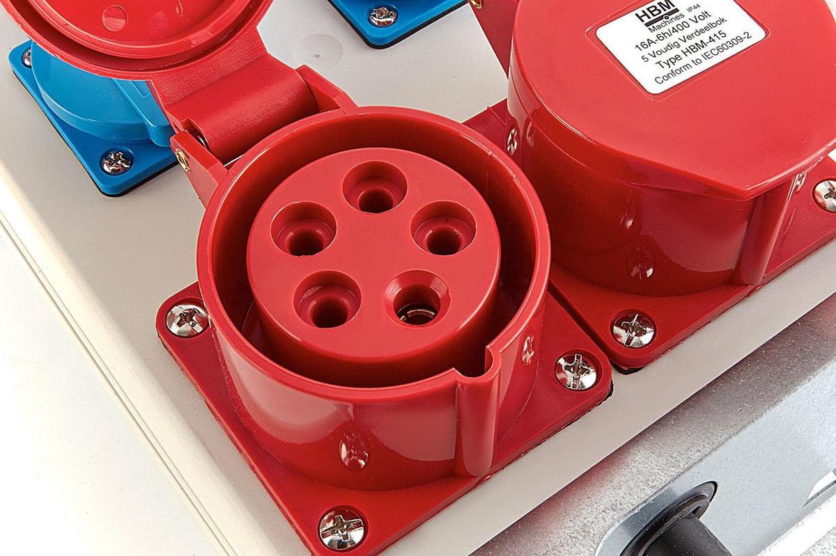Compacte werfkast 16A, 400V met 2 krachtstroom- en 4 stopcontacten, voorzien van betrouwbare beveiliging.