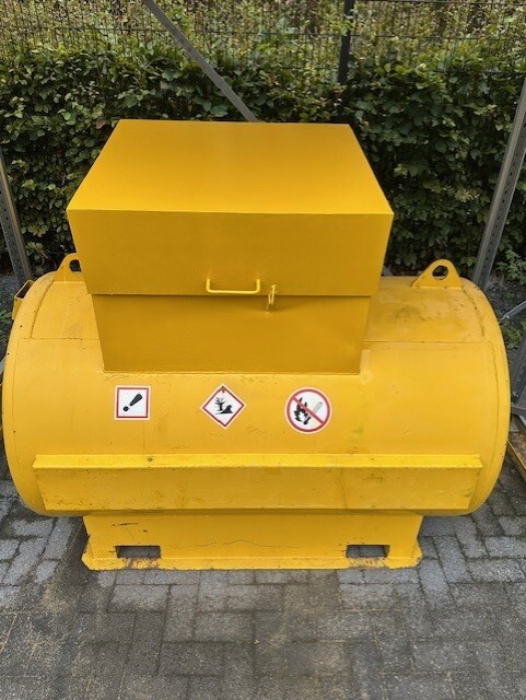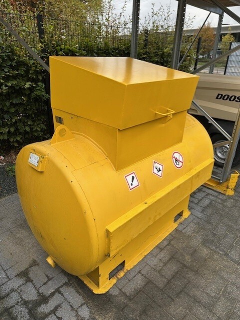 Robuuste 1200 liter brandstoftank voor veilige opslag en bevoorrading op de werf. Praktische en kostenefficiënte oplossing voor mobiele machines en stroomgroepen.